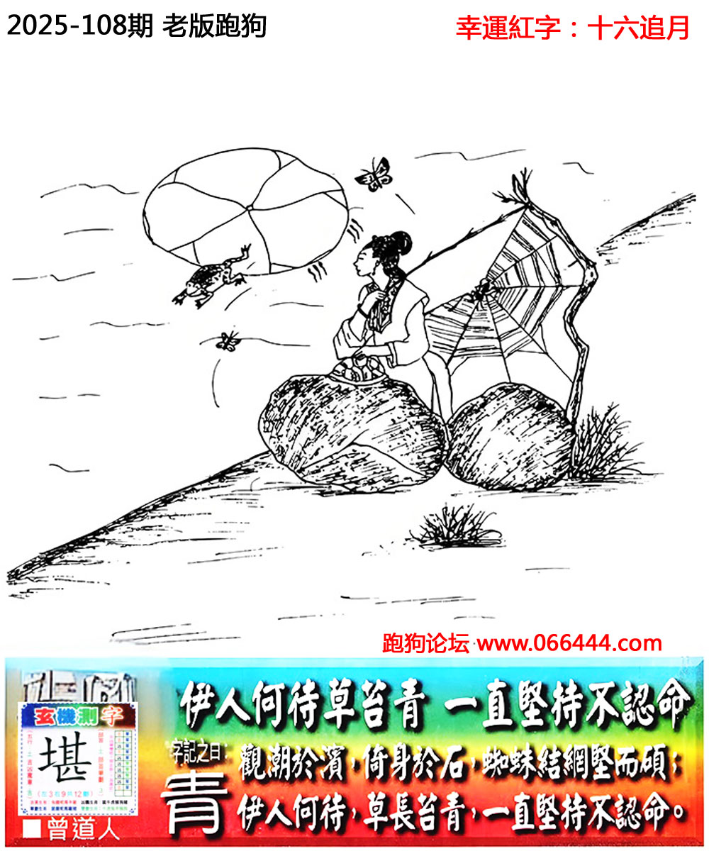 108期老版跑狗一字記之曰:【青】 詩雲:伊人何待草苔青,一直堅持不認命。 觀潮於濱,倚身於石,蜘蛛結網堅而碩; 伊人何待,草長苔青,一直堅持不認命。 玄機測字:《堪》